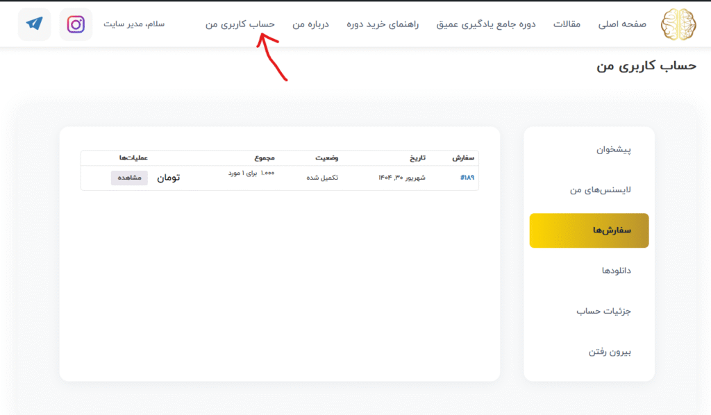 پس از تکمیل پرداخت، در عرض چند دقیقه دوره برای شما فعال میشود و میتوانید از منوی «حساب کاربری من» در بالای صفحه و سپس در منوی سفارش ها، مطابق تصویر زیر، به محتوای دوره دسترسی پیدا کنید.